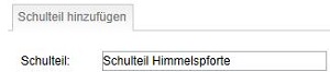 Zu jedem Hauptstandort einer Schule können beliebige Schulteile aufgenommen werden. Hierzu muss zuerst im Reiter "Schulteile" mittels der Schaltfläche  ein Name im Freitextfeld "Schulteil" erfaßt werden.