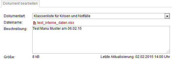 Ordnen Sie die Dokumentart "Klassenliste für Krisen und Notfälle" zu, wählen Sie die entsprechende Datei (ausschließlich Formate xls und xlsx) von Ihrem Computer aus und tragen Sie eine aussagekräftige Beschreibung ein. Es wird empfohlen, das Erstellungsdatum der Datei mit in der Beschreibung zu vermerken.