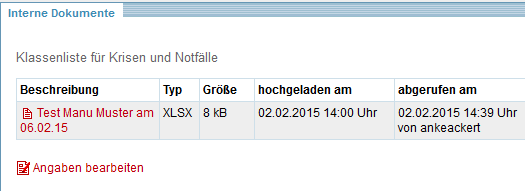 Nach dem Speichern wird in der mittleren Box die Klassenliste angezeigt. Zusätzliche Informationen sind das Datum des Hochladens und Abrufinformationen, falls vorhanden. Mittels Abrufinformation kann man erkennen, wer, wann die Klassenliste eingesehen hat