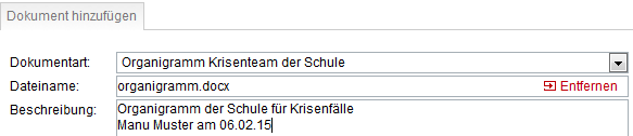 Zur Erfassung eines neuen ‚Organigramm Krisenteam der Schule‘ im Format *.doc(x) oder *.pdf wählen Sie die entsprechende Dokumentenart aus und verfahren wie oben beschrieben.