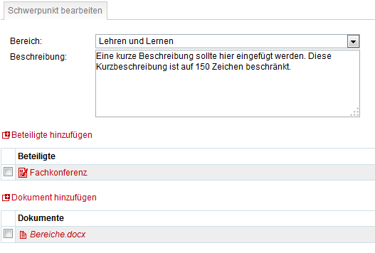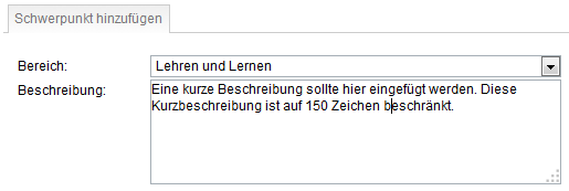 In dieser Kategorie können maximal fünf Bereiche erfasst werden, da es um die Nennung von Schwerpunkten geht. Der Bereich kann aus einem Drop-Down-Menü gewählt werden. Die Beschreibung ist auf 150 Zeichen begrenzt. Es können beliebige eigene Dokumente zu den Schwerpunkten der Schulentwicklung hinzugefügt werden.