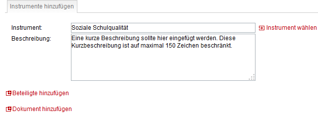 Das Schulentwicklungsinstrument kann aus einem Drop-Down-Menü gewählt werden. Nutzt Ihre Schule ein Instrument, welches nicht in der Liste vorhanden ist, können Sie hier einen Freitext eingeben. Die Beschreibung ist auf 150 Zeichen begrenzt. Auch hier können Beteiligte aus dem Drop-Down-Menü  gewählt und hinzugefügt werden. Ebenso können beliebige eigene Dokumente zu den verwendeten Instrumenten der Schulentwicklung hinzugefügt werden.