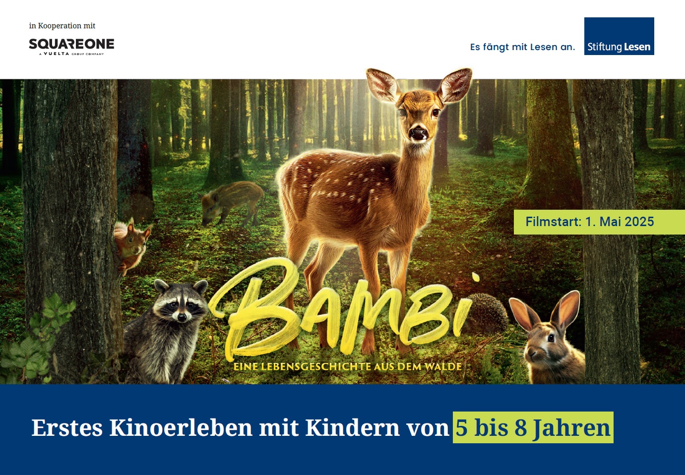 Bambi eröffnet zahlreiche Ansatzpunkte für die Arbeit in Kita und Grundschule: Anlässlich des Filmstarts stellen wir Ihnen pädagogische Impulse rund um den (ersten) Kinobesuch mit Kindern im Alter von 5 bis 8 Jahren und die inhaltliche Auseinandersetzung mit den Themen des Films zur Verfügung – von Freundschaft und Erwachsenwerden bis zum Wandel des Waldes im Lauf der Jahreszeiten.