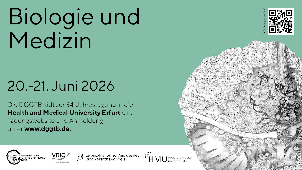 Die Deutsche Gesellschaft für die Geschichte und Theorie der Biologie (DGGTB e. V.) lädt zur diesjährigen 34. Jahrestagung in die Health and Medical University Erfurt (HMU) ein! Das Tagungsthema widmet sich den vielfältigen Beziehungen der Bereiche Biologie und Medizin. Ob in historischen Wechselwirkungen, in gemeinsamen Begriffen und Theorien oder in institutionellen Praktiken und technischen Entwicklungen – Biologie und Medizin sind eng miteinander verflochten und prägen einander bis heute.