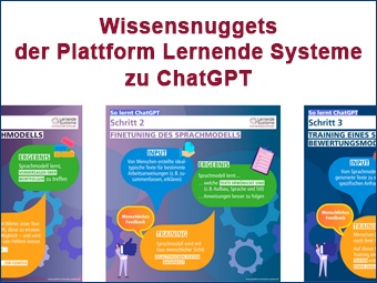 In diesem Lernobjekt befinden sich folgende Wissensnuggets (Infografiken) der Plattform Lernende Systeme zum Thema ChatGPT. - ChatGPT in Kürze - So lernt ChatGPT, Schritt 1 - So lernt ChatGPT, Schritt 2 - So lernt ChatGPT, Schritt 3 - So lernt ChatGPT, Schritt 4