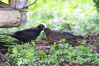 Das Foto hehört zur Serie "Amseln". Es zeigt ein Amselmännchen beim Füttern eines Jungvogels. Die Männchen sind schwarz gefärbt und haben einen gelben Schnabel, das Gefieder der Weibchen ist größtenteils dunkelbraun. Es gelten die Nutzungsbedingungen der Mediothek und Pixiothek.