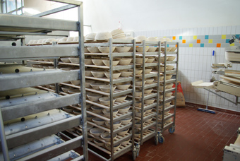 Das Bild zeigt Technik in einer Bäckerei. Zu sehen sind Gärkörbchen für Brotteig in Backregalen mit Rollen. Das Bild ist unter CC0 lizenziert und kann somit frei verwendet werden.