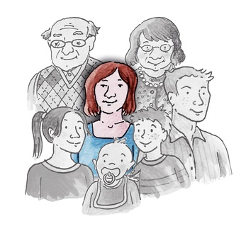 Das Bild gehört zur Serie "Familienmitglieder als Zeichnung". Es zeigt die Mutter im Kreise ihrer Familie. Es gelten die Nutzungsbedingungen der Mediothek und Pixiothek.