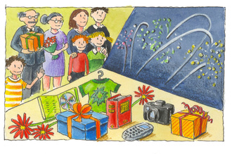 Das Bild gehört zur Serie "Weihnacht". Es zeigt gezeichnete Weihnachtsgeschenke und Familie. Es gelten die Nutzungsbedingungen der Mediothek und Pixiothek.