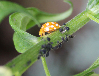 Das Foto hehört zur Serie "Käfer". Es zeigt den Sechzehnfleckigen Marienkäfer (Halyzia sedecimguttata), oder auch Sechzehnfleckiger Pilz-Marienkäfer genannt, aus der Familie der Marienkäfer mit Blattläusen. Es gelten die Nutzungsbedingungen der Mediothek und Pixiothek.