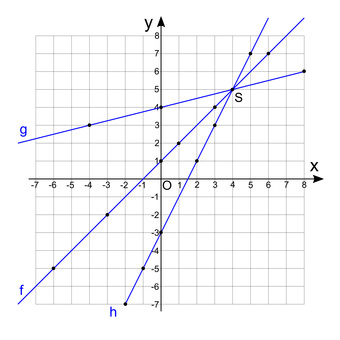 Das Bild gehört zur Serie "Mathematik, lineare Funktionen". Es zeigt im Koordinatensystem drei lineare Funktionen. Die Funktionsgleichungen sind zu ermitteln. Weiterhin können Koordinaten von Schnittpunkten und Nullstellen abgelesen werden. Das Bild steht in den Ausführungen normal, leichte Hilfen, und mehrfache Hilfen zur Verfügung. Das Bild ist unter CC0 lizenziert und kann somit frei verwendet werden.