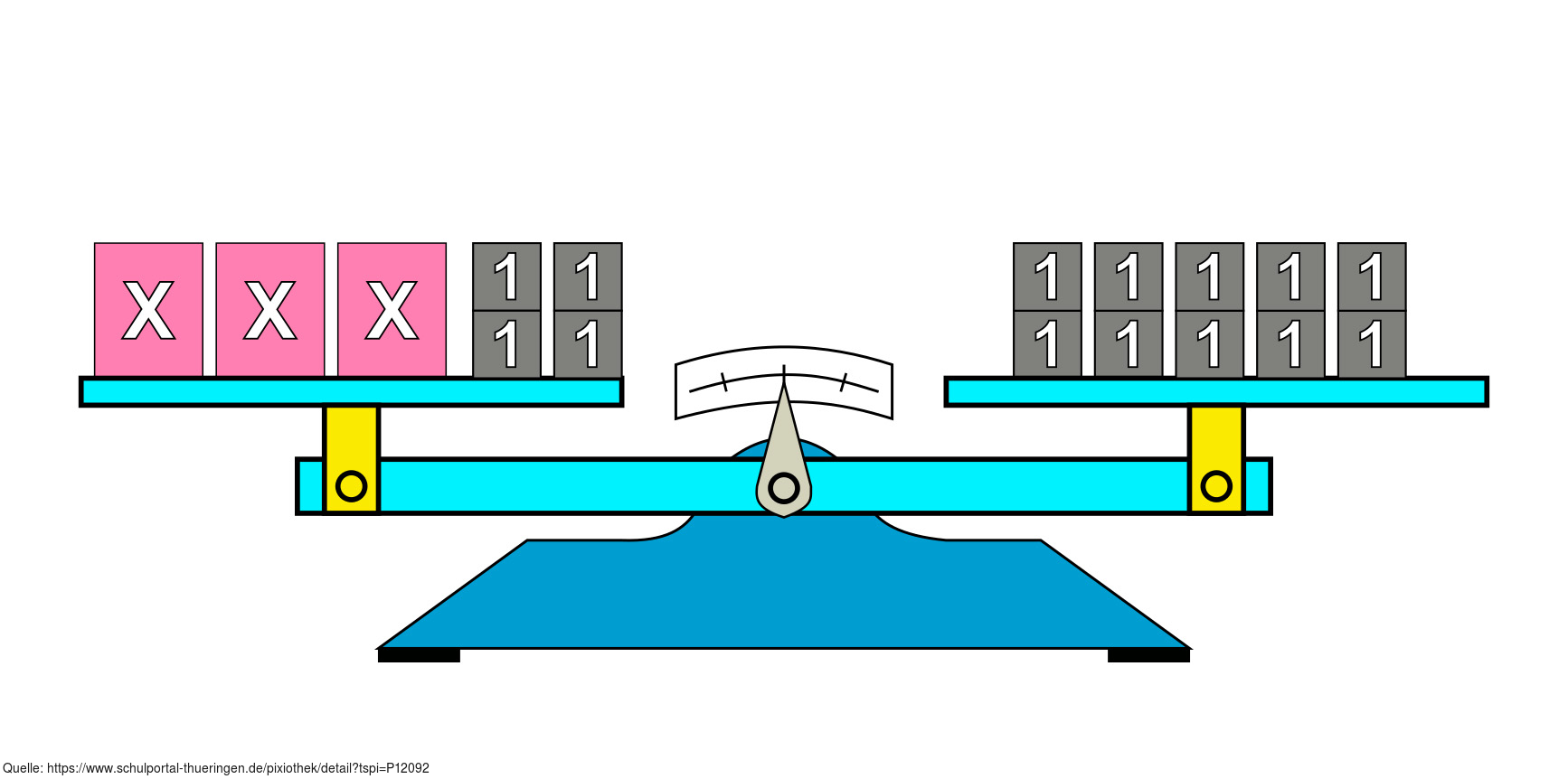 Das Bild gehört zur Serie "Mathematik, Gleichungen". Es veranschaulicht die Lösung einer linearen Gleichung durch Äquivalenzumformung mit dem Bild einer Waage. Zur Gleichung 11 veranschaulichen die Bilder 11-1 bis 11-3 die Umformungsschritte. Das Bild ist unter CC0 lizenziert und kann somit frei verwendet werden.