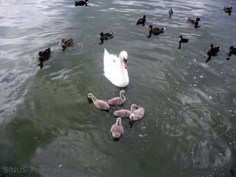 Das Bild zeigt einen Schwan mit Jungvögeln und Enten. Die Schwäne (Cygnus) sind eine Gattung der Entenvögel (Anatidae). Es gelten die Nutzungsbedingungen der Mediothek und Pixiothek.