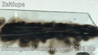 Das Video zeigt ein Experiment zur Darstellung der Schwingung einer Stimmgabel auf berußter Glasblatte. Das Video ist unter CC0 lizenziert und kann somit frei verwendet werden.