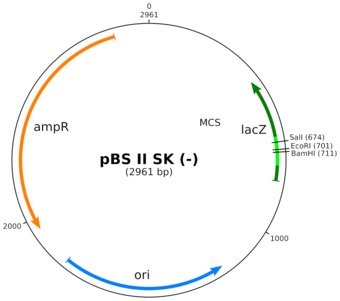 Plasmidkarte von pBSII zur Bakterien-Klonierung mittels Blau-Weiß-Screening (ampR, lacZ).