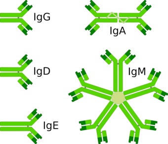Übersicht über die humanen Immunglobulin-Klassen. Es gelten die Nutzungsbedingungen der Mediothek und Pixiothek. Auf http://unterricht.petzinger.net/biochdropbox.html auch als svg und in CC-BY verfügbar.