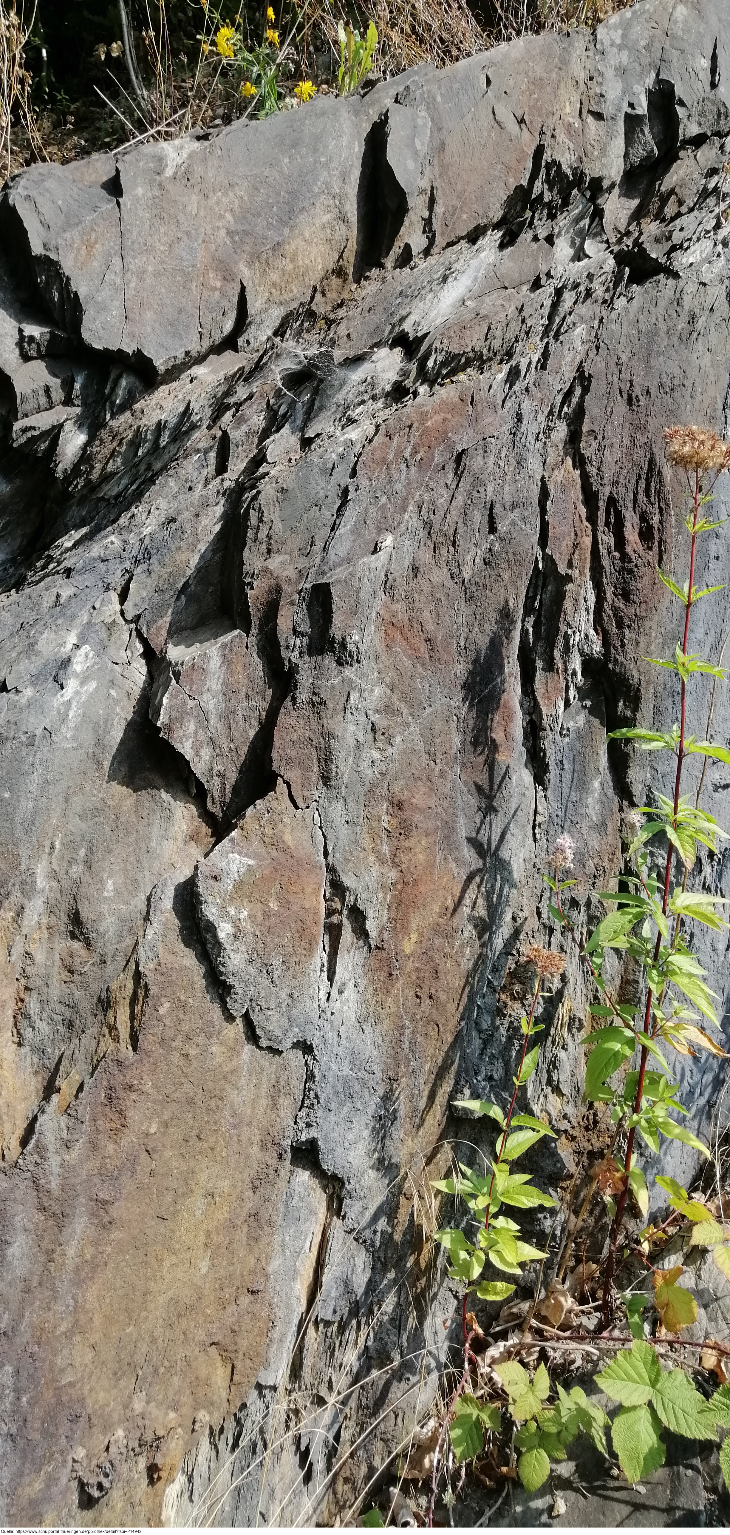 Das Bild gehört zur Serie „Sattelbildung im Kulmschiefer“. Es zeigt den geologischen Aufschluss „Sattelbildung im Kulmschiefer“, an welchem das Gestein des Untergrundes zu Tage tritt und man die erdgeschichtliche Entwicklung des Naturparkes „Thüringer Schiefergebirge / Obere Saale“ nachvollziehen kann. Die Ziegenrücker Falte, eine Großfalte in der Ziegenrücker (Kulm-)Mulde, verdeutlicht eindrucksvoll die immensen Kräfte, die während der Variszischen Gebirgsbildung gewirkt haben.
