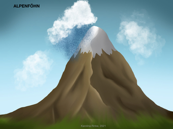Das Bild gehört zur Serie "Grafische Darstellung Alpenföhn". Das Bild verdeutlicht den Alpenföhn (Föhnwind des Alpenraumes). Bild-Variante: Berg mit Wolken und Niederschlag; farbig; unbeschriftet. Es gelten die Nutzungsbedingungen der Mediothek und Pixiothek.