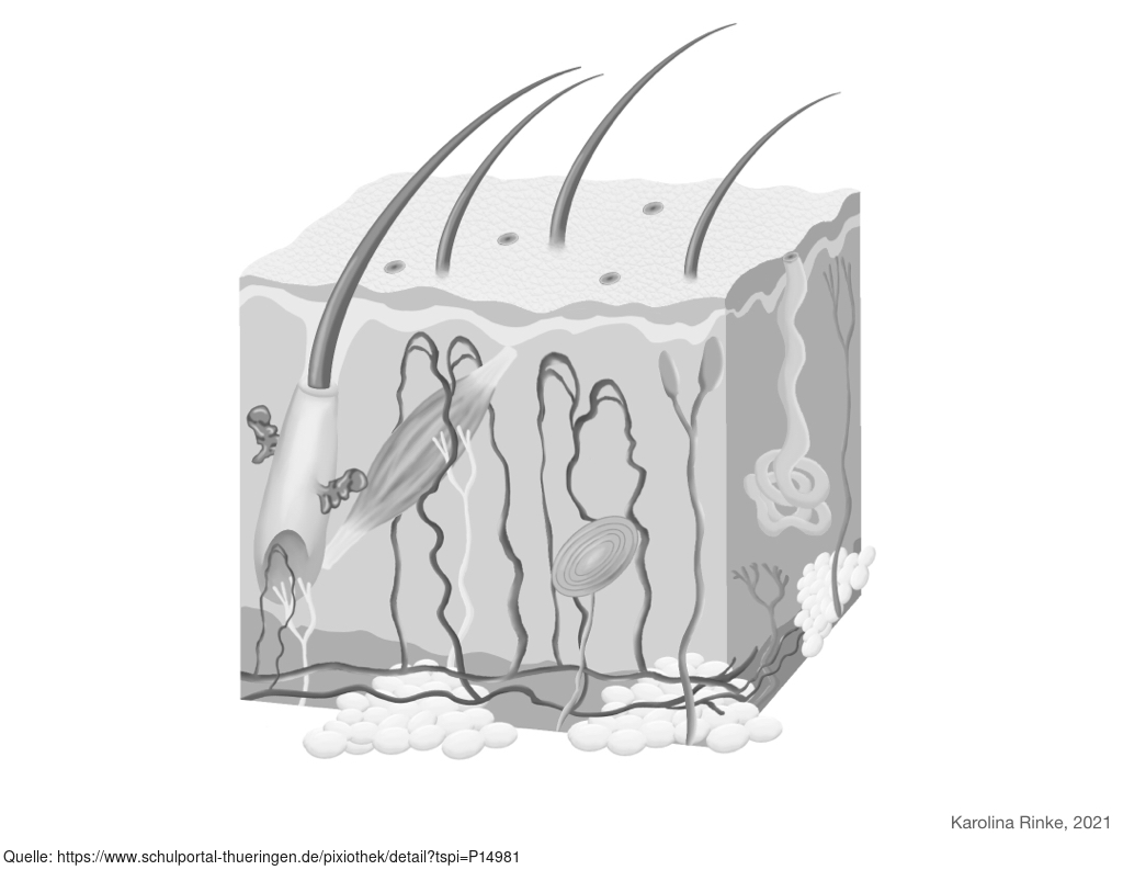 Das Bild gehört zur Serie "Organe des Menschen". Das Bild verdeutlicht den Aufbau der menschlichen Haut. Bild-Variante: s/w; unbeschriftet. Es gelten die Nutzungsbedingungen der Mediothek und Pixiothek.