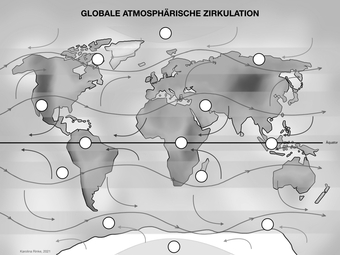 Das Bild gehört zur Serie „Zirkulationssysteme der Erde“. Es verdeutlicht die globale atmosphärische Zirkulation der Erde. Bild-Variante: s/w; unbeschriftet; mit Pfeilen für Winde. Es gelten die Nutzungsbedingungen der Mediothek und Pixiothek.
