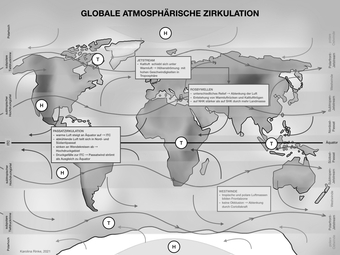Das Bild gehört zur Serie „Zirkulationssysteme der Erde“. Es verdeutlicht die globale atmosphärische Zirkulation der Erde. Bild-Variante: s/w; beschriftet. Es gelten die Nutzungsbedingungen der Mediothek und Pixiothek.