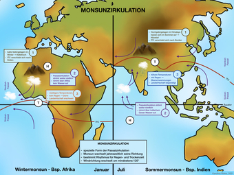 Das Bild gehört zur Serie „Zirkulationssysteme der Erde“. Es verdeutlicht die Monsunzirkulation der Erde. Bild-Variante: farbig; beschriftet. Es gelten die Nutzungsbedingungen der Mediothek und Pixiothek.
