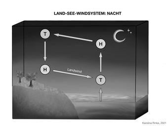 Das Bild gehört zur Serie „Zirkulationssysteme der Erde“. Es verdeutlicht das Land-See-Windsystem der Erde. Bild-Variante: s/w; beschriftet; Nacht. Es gelten die Nutzungsbedingungen der Mediothek und Pixiothek.