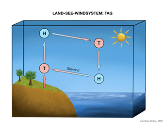 Das Bild gehört zur Serie „Zirkulationssysteme der Erde“. Es verdeutlicht das Land-See-Windsystem der Erde. Bild-Variante: farbig; beschriftet; Tag. Es gelten die Nutzungsbedingungen der Mediothek und Pixiothek.