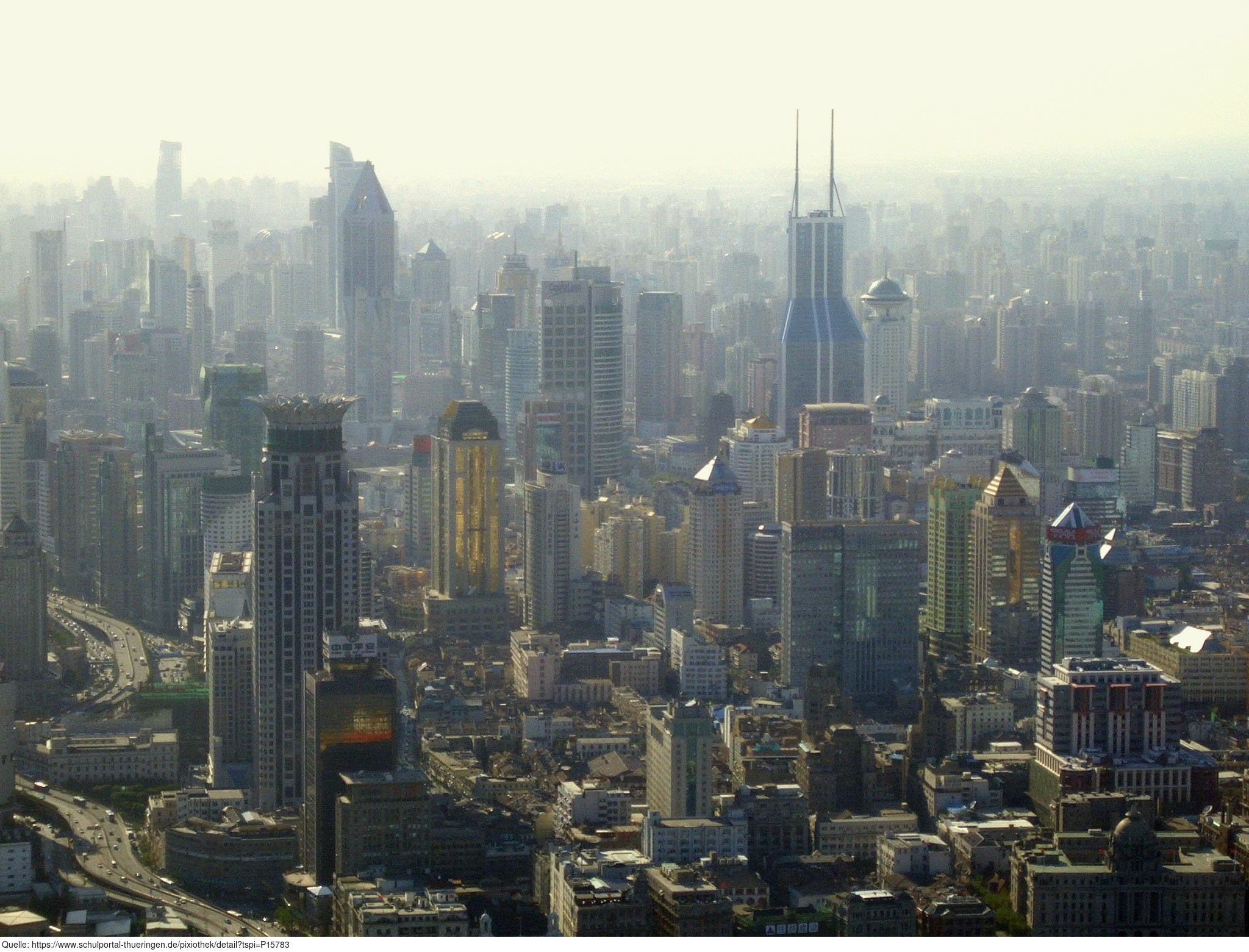 Das Foto gehört zu einer Serie mit 3 Motiven der Stadt Shanghai, aufgenommen im Oktober 2005. Die Fotos liegen jeweils im Original vor (sonniges Wetter, aber dunstig) sowie in einer bearbeiteten Version (Helligkeit herab-, Kontrast heraufgesetzt, Farbtemperatur und -ton verbessert; subjektiver Eindruck). Die Bilder dieser Serie können als Anregung bzw. als Einstieg für das Thema Bildbearbeitung dienen.