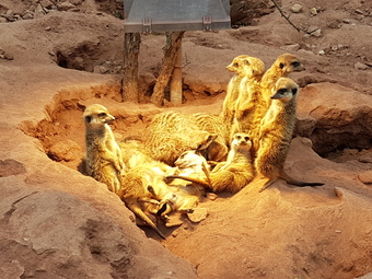 Auf dem Foto abgebildet sind Erdmännchen unter einer Wärmequelle.. Es gelten die Nutzungsbedingungen der Mediothek und Pixiothek.