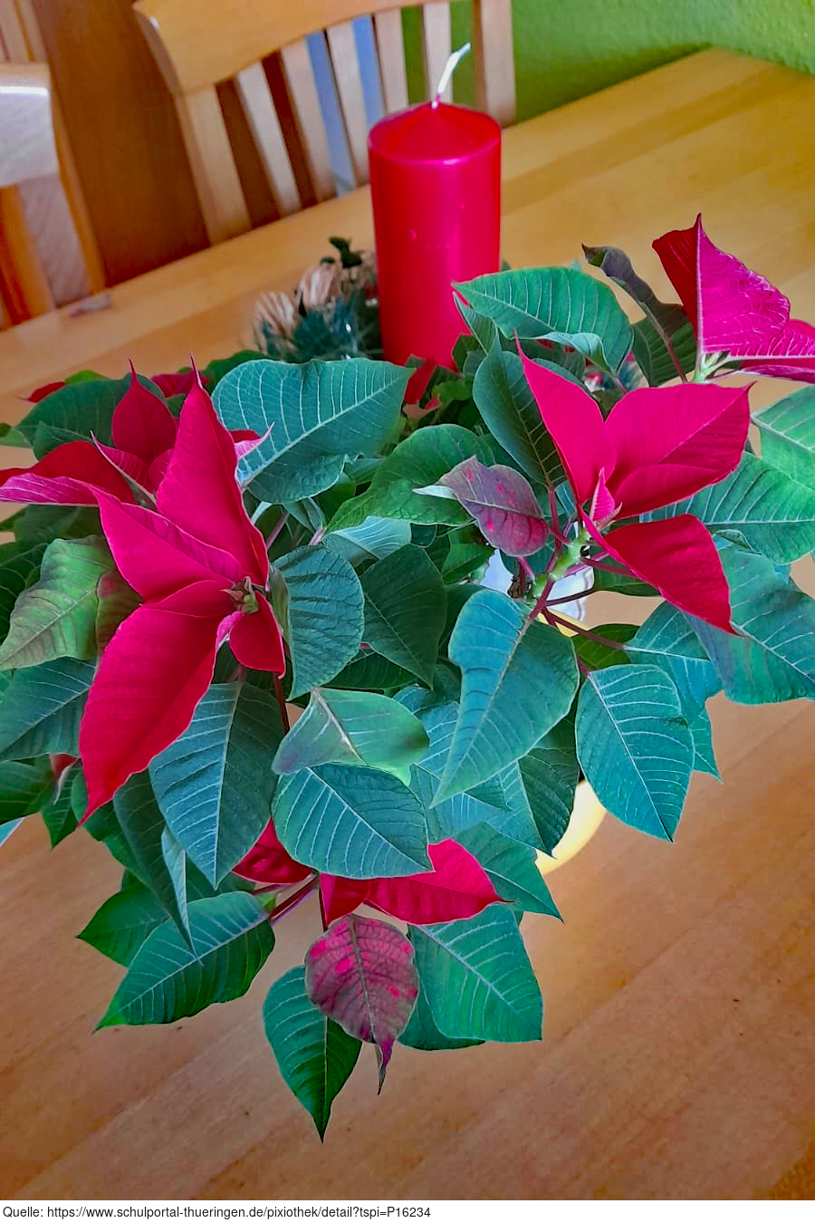Das Foto gehört zur Serie "Weihnacht". Es zeigt einen Weihnachtsstern (wissenschaftlicher Name: Euphorbia pulcherrima) aus der Familie der Wolfsmilchgewächse (Euphorbiaceae). Es gelten die Nutzungsbedingungen der Mediothek und Pixiothek.