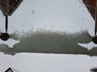 Das Foto zeigt Schnee auf einem schrägen Vordach aus Glas, der langsam nach vorn abrutscht. Das Motiv kann auch als Modellansicht für die Bewegung von Gletschern genutzt werden. Das Bild ist unter CC0 lizenziert und kann somit frei verwendet werden.