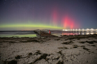 Das Bild gehört zur Serie „Polarlichter 2023 Zingst“. Es zeigt Polarlichter, die in der Nacht vom 26. Auf den 27. Februar 2023 gegen 0:30 in Zingst auf dem Darß mit einer Canon EOS RP aufgenommen wurden. Die Kameraeinstellungen: ISO 1600; Blende 2,8; 15 Sekunden Belichtung; manueller Modus. Mit bloßem Auge waren die Polarlichter in dieser Nacht deutlich zu sehen, aber natürlich nicht so farbenfroh wie auf dem Foto. Es gelten die Nutzungsbedingungen der Mediothek und Pixiothek.