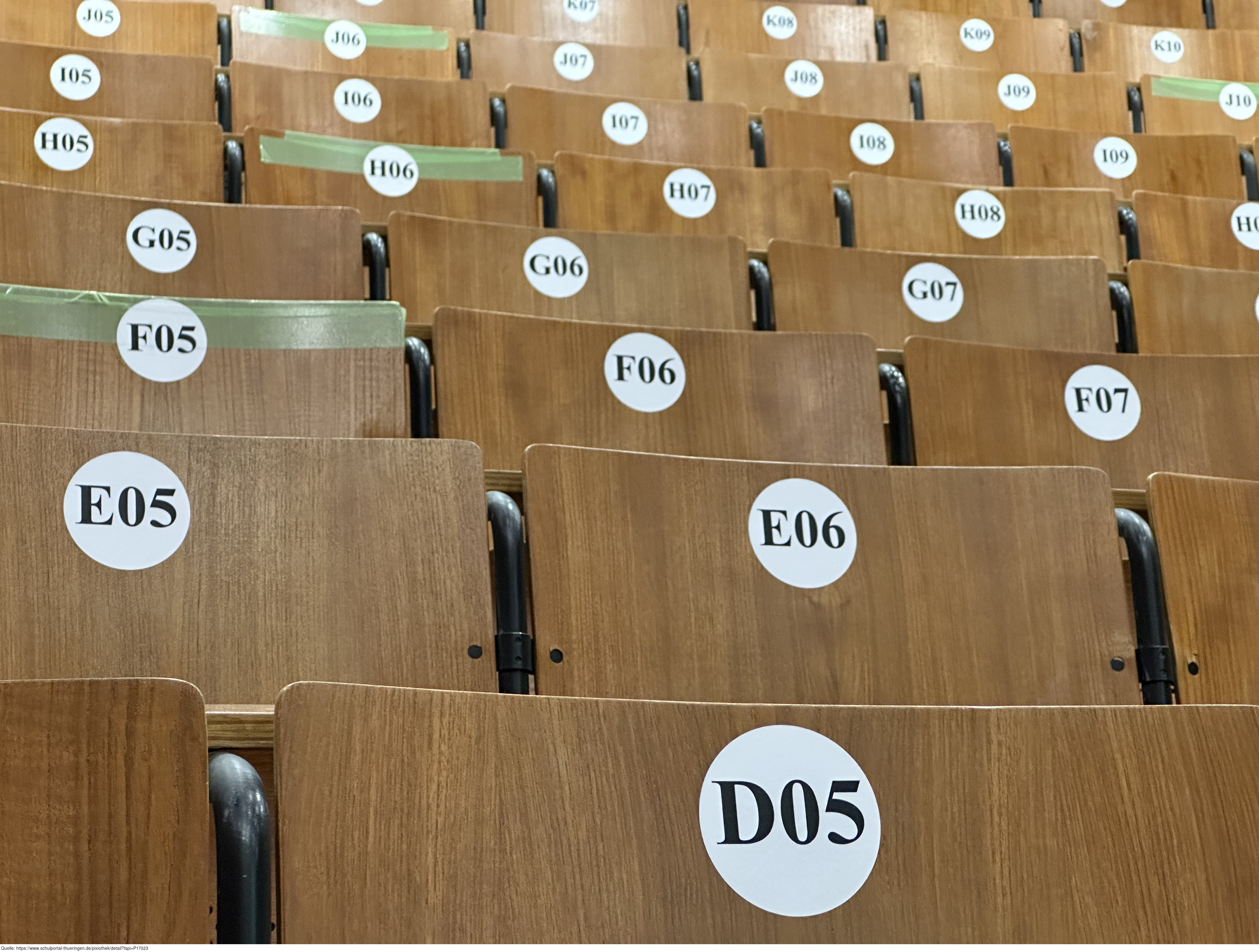 Das Bild zeigt Stühle in einem Hörsaal. Es wurde erstellt von Peter Bernardi für SeLL, HHU Düsseldorf. Es gelten die Nutzungsbedingungen der Mediothek und Pixiothek.