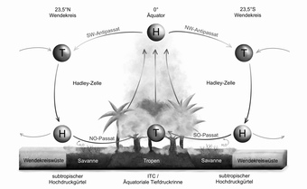 Das Bild gehört zur Serie „Windsysteme“. Es verdeutlicht aus der Querschnittsperspektive die Windzirkulation vom Äquator bis zu den Wendekreisen. Variante: s/w; beschriftet. Es gelten die Nutzungsbedingungen der Mediothek und Pixiothek.