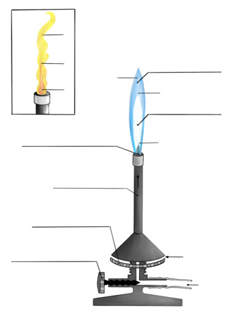 Das Bild verdeutlicht den Aufbau eines Bunsenbrenners. Variante: zwei Flammen, farbig; unbeschriftet. Es gelten die Nutzungsbedingungen der Mediothek und Pixiothek.