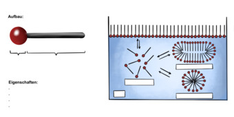 Das Bild verdeutlicht den allgemeinen Aufbau eines Tensids sowie die Mizellenbildung in Wasser. Variante: farbig; unbeschriftet. Es gelten die Nutzungsbedingungen der Mediothek und Pixiothek.