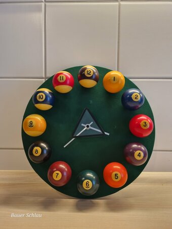 Das Bild zeigt eine Uhr unter Verwendung von Billardkugeln. Das Foto kann als Anregung für ein Technikprojekt dienen. Es gelten die Nutzungsbedingungen der Mediothek und Pixiothek.