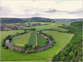 Das Bild zeigt die Werra bei Lauchröden, aufgenommen 2017. Östlich von Lauchröden bildet der Fluss einen Mäander, welcher im Volksmund auch als Kuchenschieber, Stiefel, Glocke oder Helm bezeichnet wird. Es gelten die Nutzungsbedingungen der Mediothek und Pixiothek.