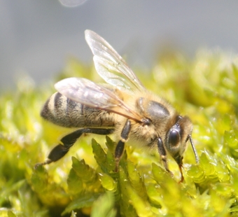 Honigbiene nimmt Wasser von Moos auf