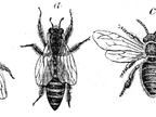Das Bild gehört zur Serie "Saalfelder Honig", aufgenommen vom Imker Bernd Rümpler, Inhaber von saalfelder-honig.de. Zu sehen ist eine Bienenwabe mit Eiern und Maden. Links unten: frisch gelegte Eier (Stifte). Darüber: kleine geschlüpfte Maden im Futtersaft. Rechts oben: große Maden im Futtersaft.