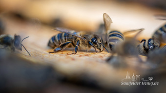 Das Bild gehört zur Serie "Saalfelder Honig", aufgenommen vom Imker Bernd Rümpler, Inhaber von saalfelder-honig.de. Zu sehen ist Biene (Arbeiterin) am Flugloch. Es gelten die Nutzungsbedingungen der Mediothek und Pixiothek.