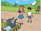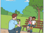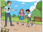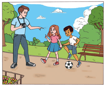 Das Bild zeigt einen Vater, der in der Hand einen Fotoapparat hält und mit seinen beiden Kindern spricht, weil er ein Foto von ihnen anfertigen möchte. Das Bild kann als Teil einer Bildergeschichte verwendet werden - siehe Funktionslink "Weitere Bilder der Serie". Es gelten die Nutzungsbedingungen der Mediothek und Pixiothek.