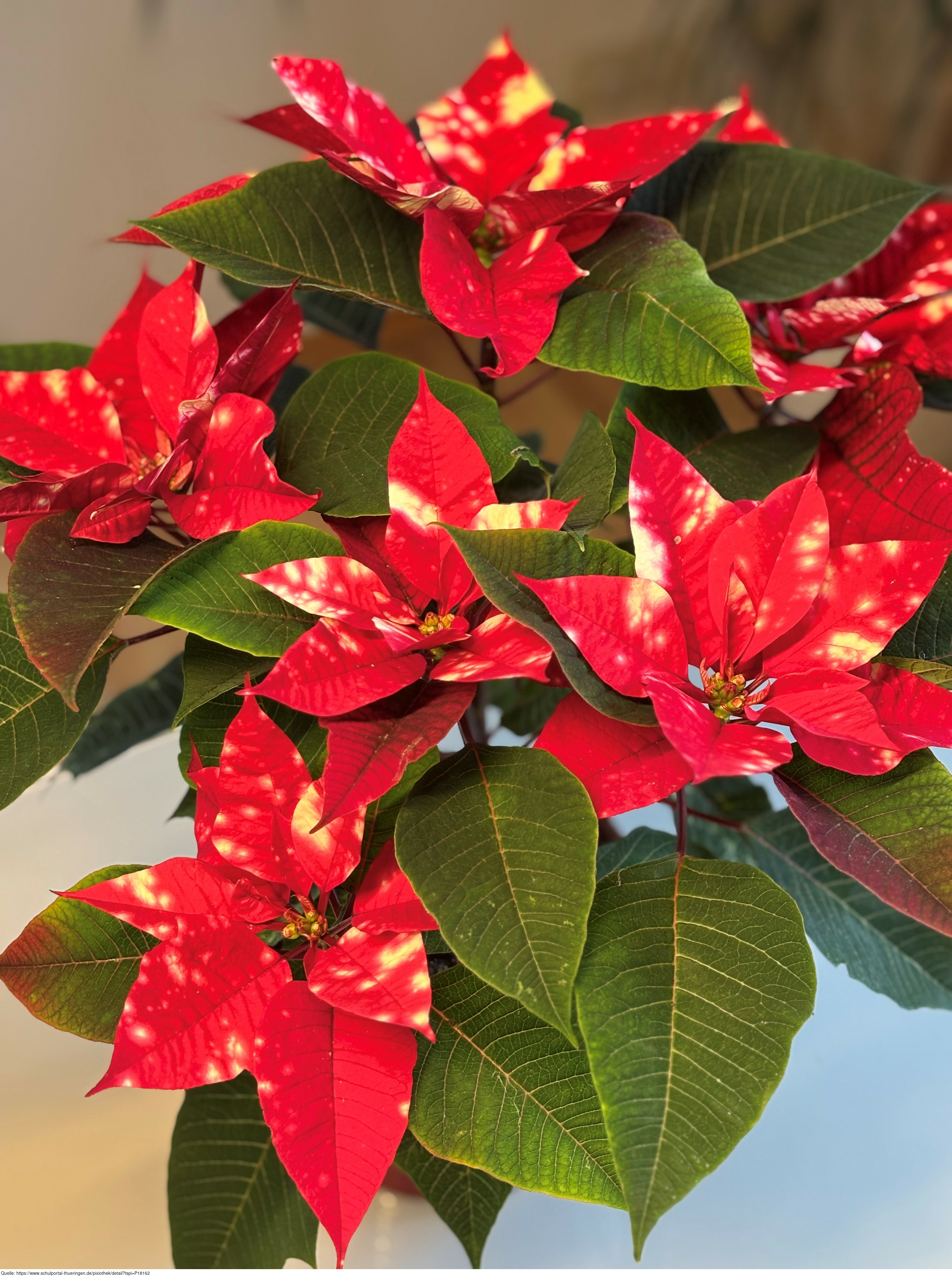 Das Foto gehört zur Serie "Weihnacht". Das Bild zeigt die rot-weißen Hochblätter der Pflanze Euphorbia pulcherrima, bekannt als Weihnachts-, Advents,- oder Christstern. Sie gehört zur Familie der Wolfsmilchgewächse.