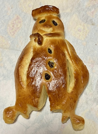 Das Foto zeigt einen fertig gebackenen Weckmann. Als Weckmann wird ein Gebäck in Form eines stilisierten Mannes aus Hefeteig bezeichnet, welches oftmals mit Rosinen verziert ist. Es gelten die Nutzungsbedingungen der Mediothek und Pixiothek
