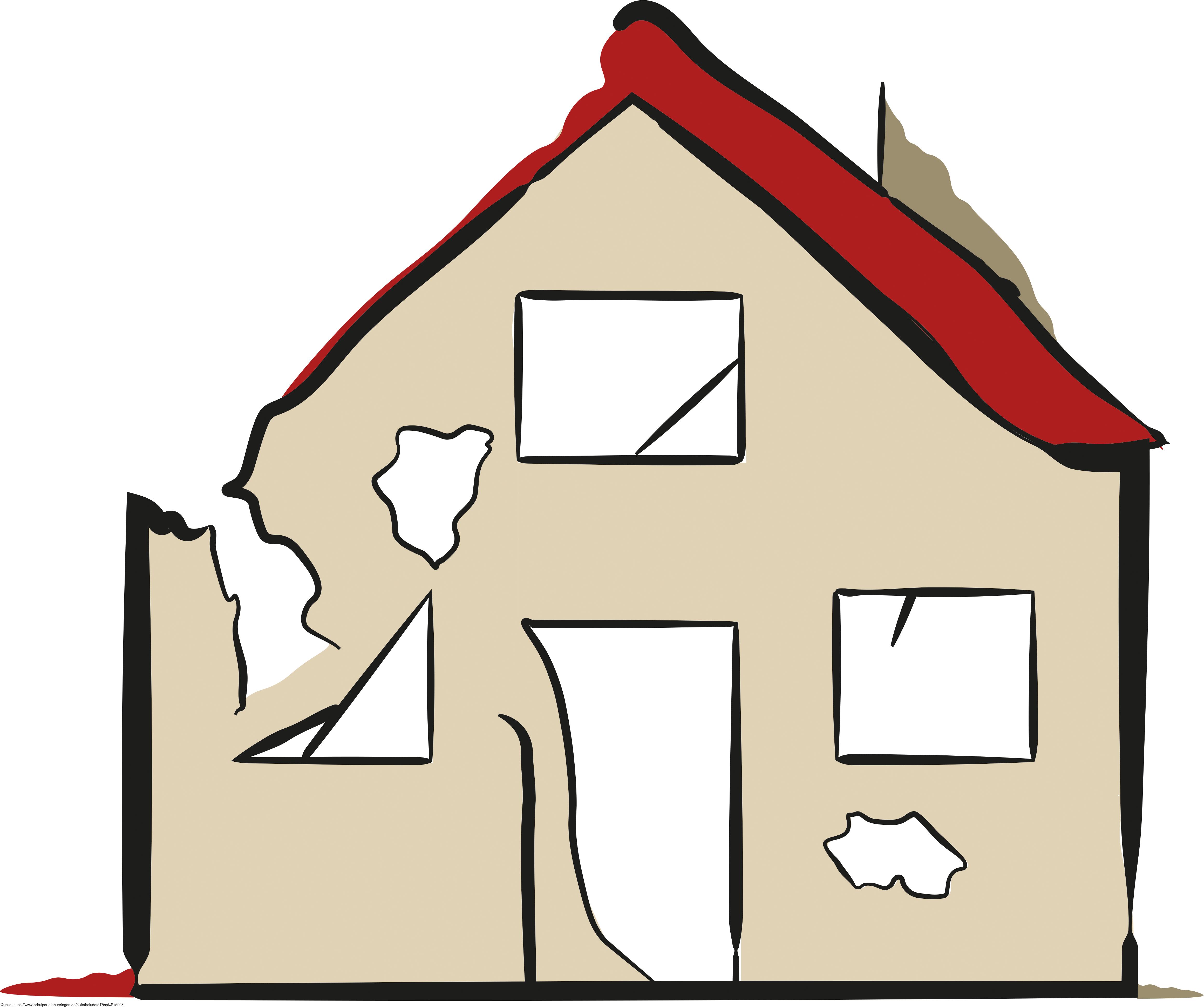 Das Bild zeigt ein gezeichnetes zerstörtes Haus bzw. eine Ruine/ Hausruine. Es stammt aus dem Projekt "Didactica Bavaria Bohemia" - Materialpakete daraus siehe "Verwandte Medien (Auswahl)". Das Bild ist unter CC0 lizenziert und kann somit frei verwendet werden.