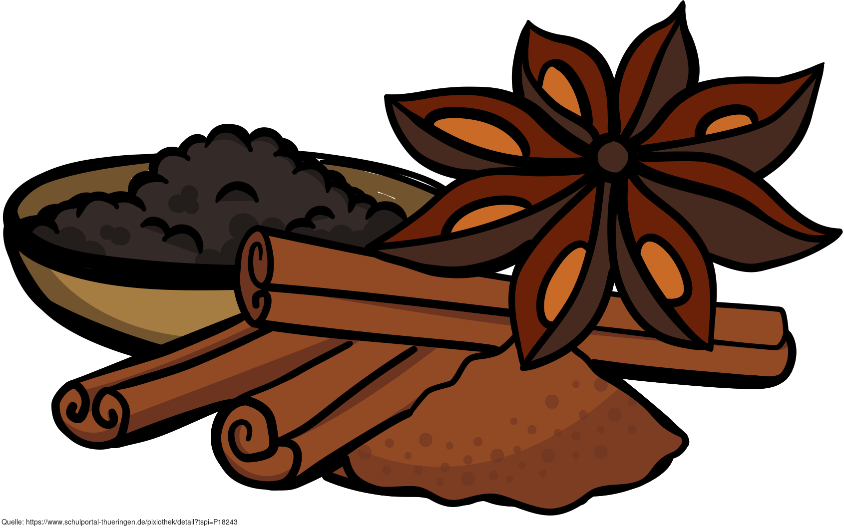 Das Bild zeigt gezeichnete Gewürze: Anis, Zimt, Pfeffer. Es stammt aus dem Projekt "Didactica Bavaria Bohemia" - Materialpakete daraus siehe "Verwandte Medien (Auswahl)". Das Bild ist unter CC0 lizenziert und kann somit frei verwendet werden.
