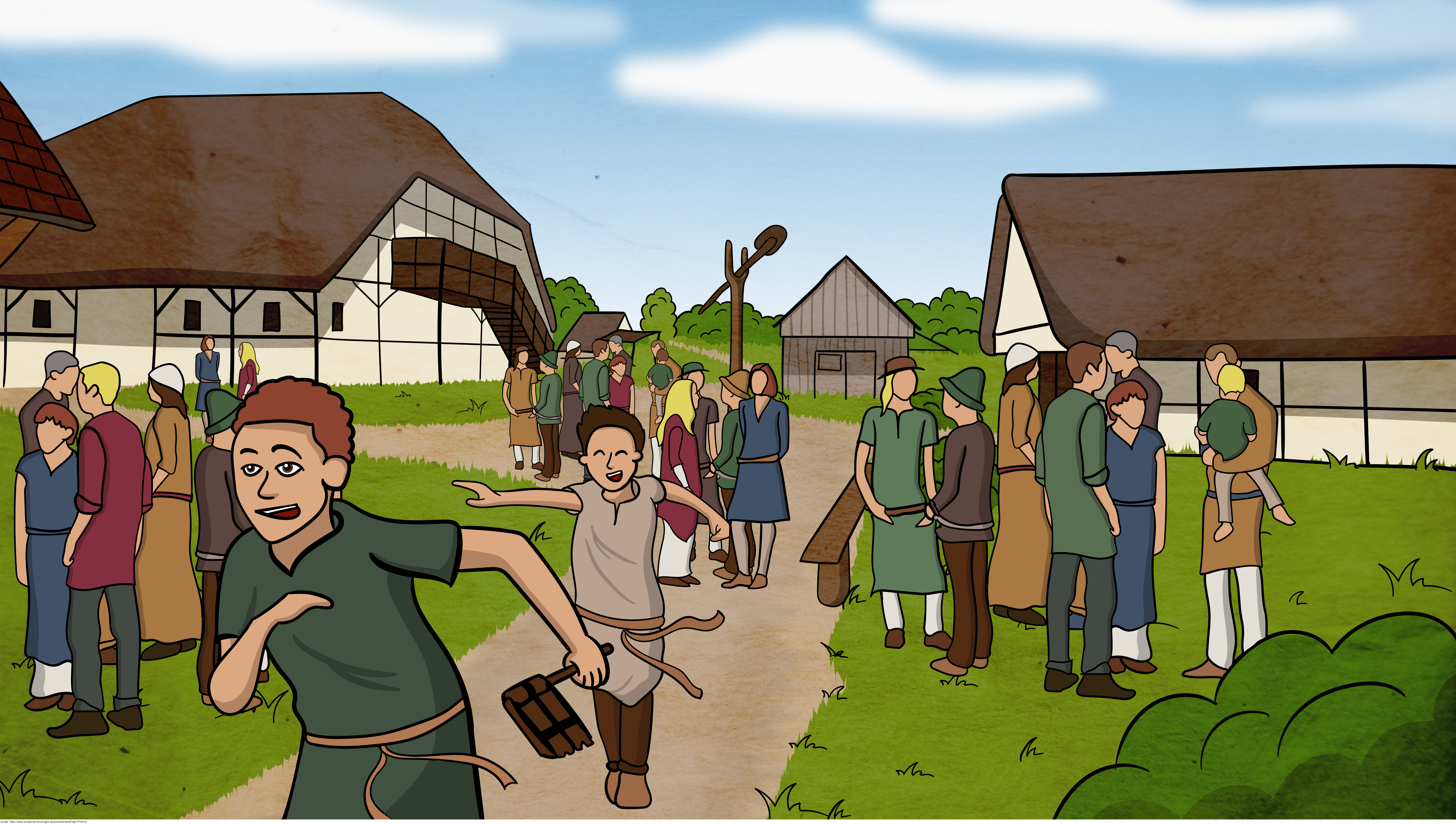 Das Bild zeigt eine gezeichnete Menschenansammlung in einer mittelalterlichen Siedlung. Es stammt aus dem Projekt "Didactica Bavaria Bohemia" - Materialpakete daraus siehe "Verwandte Medien (Auswahl)". Das Bild ist unter CC0 lizenziert und kann somit frei verwendet werden.