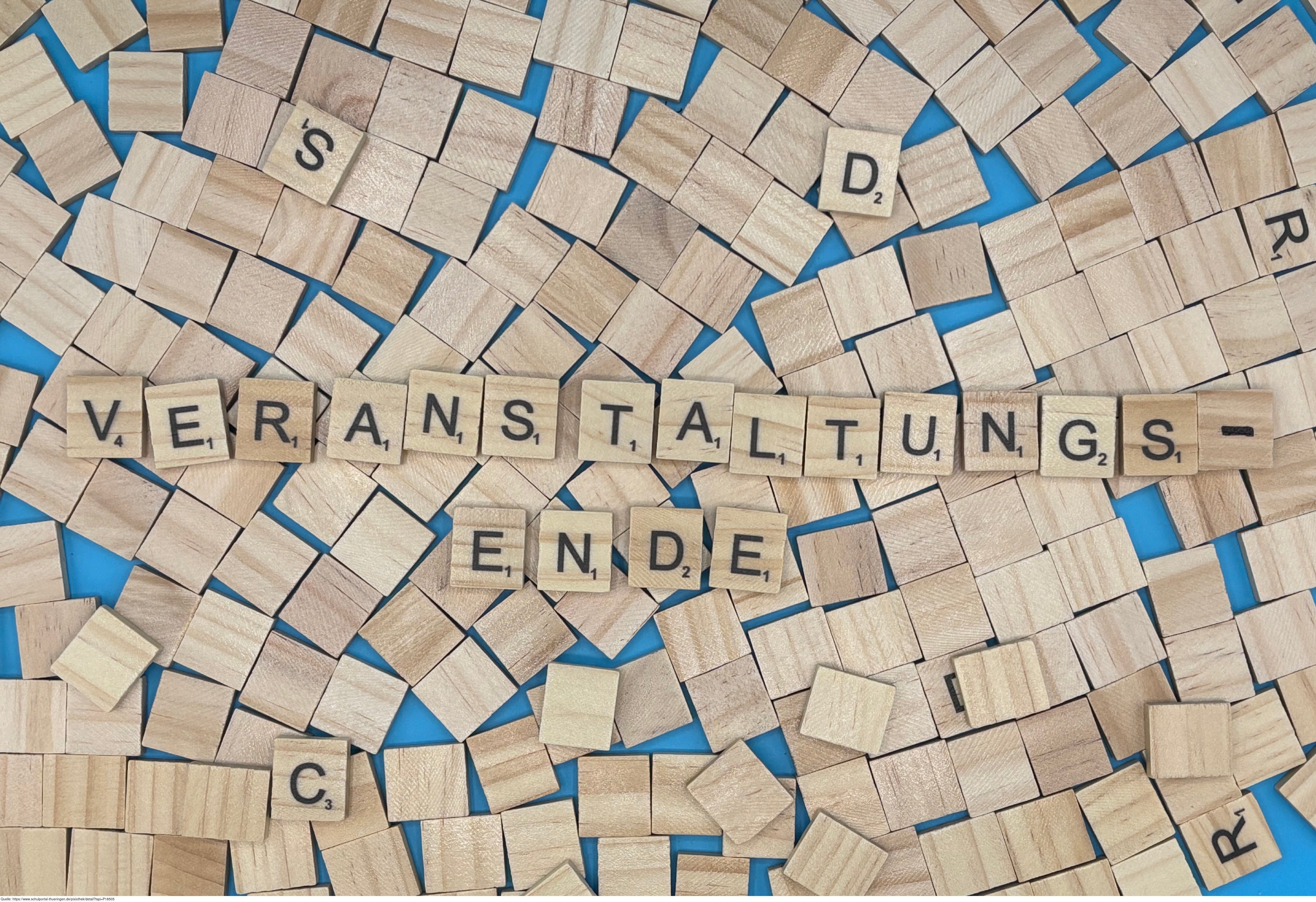 Aus Buchstaben wurde das Wort "Veranstaltungsende" gelegt. Es gelten die Nutzungsbedingungen der Mediothek und Pixiothek.
