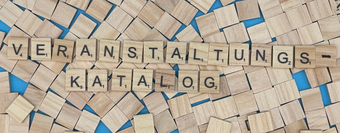 Aus Buchstaben wurde das Wort "Veranstaltungskatalog" gelegt. Es gelten die Nutzungsbedingungen der Mediothek und Pixiothek.